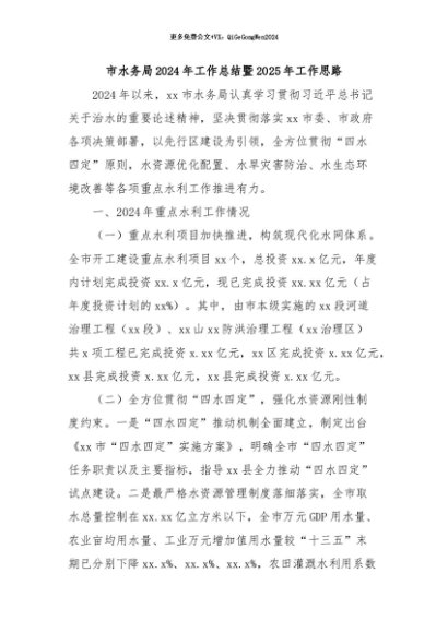 / 【七哥公文】2024年:市水务局2024年工作总结暨2025年工作思路+更多免费公文+VX:QiGeGongWen2024