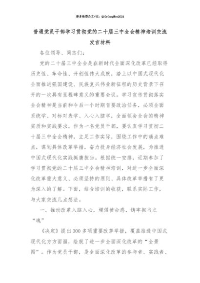 【七哥公文】2024年:普通党员干部学习贯彻党的二十届三中全会精神培训交流发言材料+更多免费公文+VX:QiGeGongWen2024