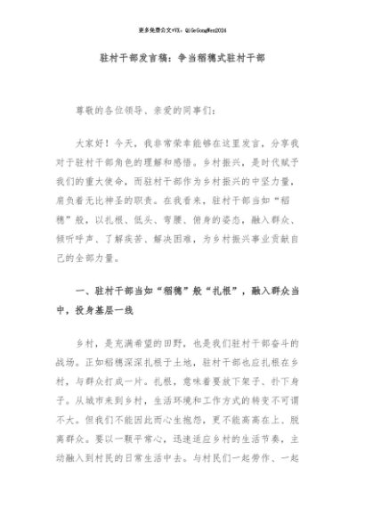 / 【七哥公文】2024年:驻村干部发言稿:争当稻穗式驻村干部+更多免费公文+VX:QiGeGongWen2024