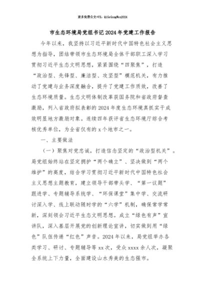 / 【七哥公文】2024年:市生态环境局党组书记2024年党建工作报告+更多免费公文+VX:QiGeGongWen2024