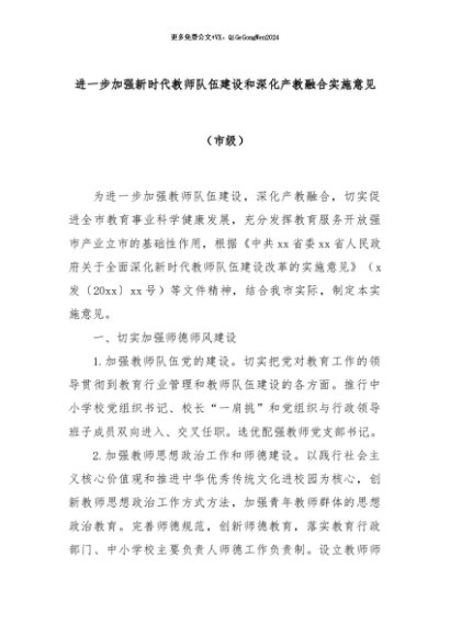 【七哥公文】2024年:进一步加强新时代教师队伍建设和深化产教融合实施意见(市级)+更多免费公文+VX:QiGeGongWen2024