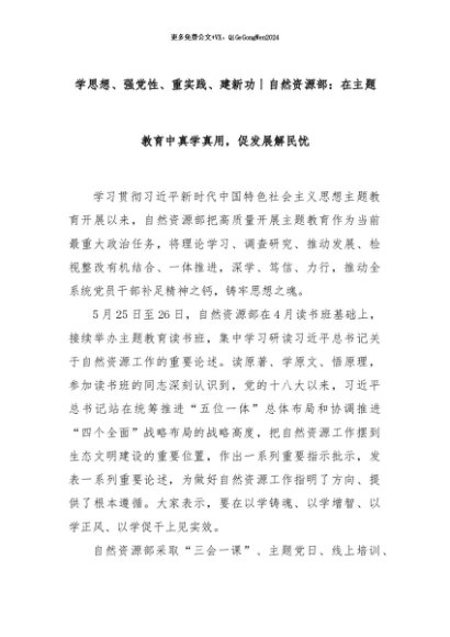 【七哥公文】2024年:学思想、强党性、重实践、建新功丨自然资源部:在主题教育中真学真用,促发展解民忧+更多免费公文+VX:QiGeGongWen2024