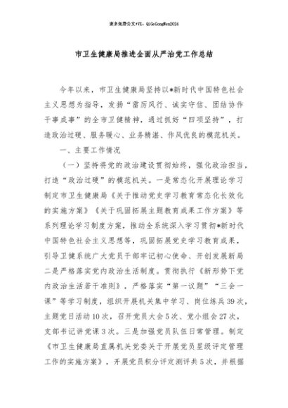 / 【七哥公文】2024年:市卫生健康局推进全面从严治党工作总结+更多免费公文+VX:QiGeGongWen2024