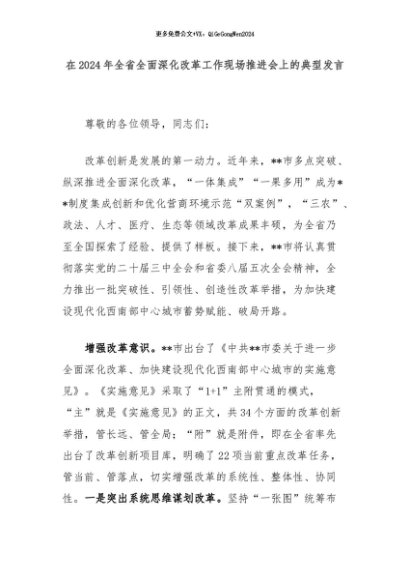 【七哥公文】2024年:在2024年全省全面深化改革工作现场推进会上的典型发言+更多免费公文+VX:QiGeGongWen2024