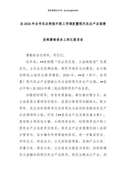 【七哥公文】2024年:在2024年全市农业转型升级工作调度暨现代农业产业园建设部署推进会上的汇报发言+更多免费公文+VX:QiGeGongWen2024