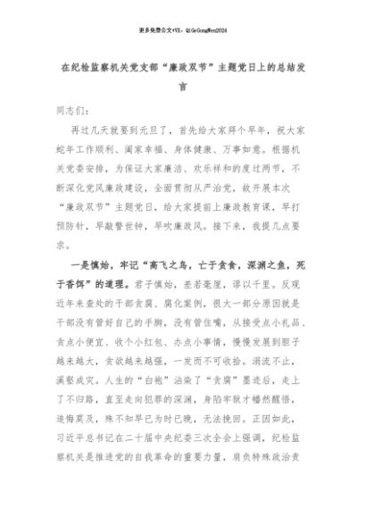 【七哥公文】2024年:在纪检监察机关党支部“廉政双节”主题党日上的总结发言+更多免费公文+VX:QiGeGongWen2024