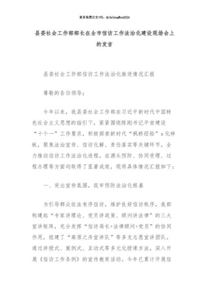 【七哥公文】2024年:县委社会工作部部长在全市信访工作法治化建设现场会上的发言+更多免费公文+VX:QiGeGongWen2024
