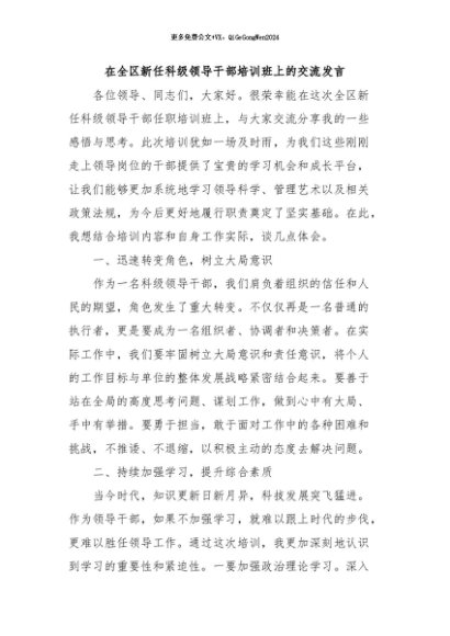 / 【七哥公文】2024年:在全区新任科级领导干部培训班上的交流发言+更多免费公文+VX:QiGeGongWen2024