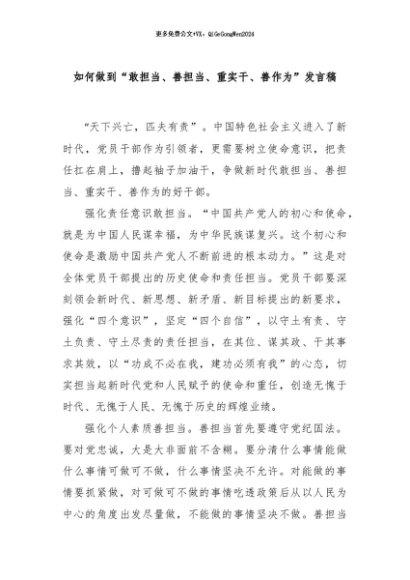 / 【七哥公文】2024年:如何做到“敢担当、善担当、重实干、善作为”发言稿+更多免费公文+VX:QiGeGongWen2024