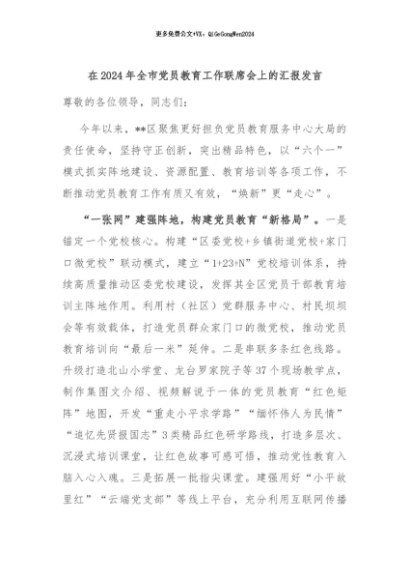 / 【七哥公文】2024年:在2024年全市党员教育工作联席会上的汇报发言+更多免费公文+VX:QiGeGongWen2024