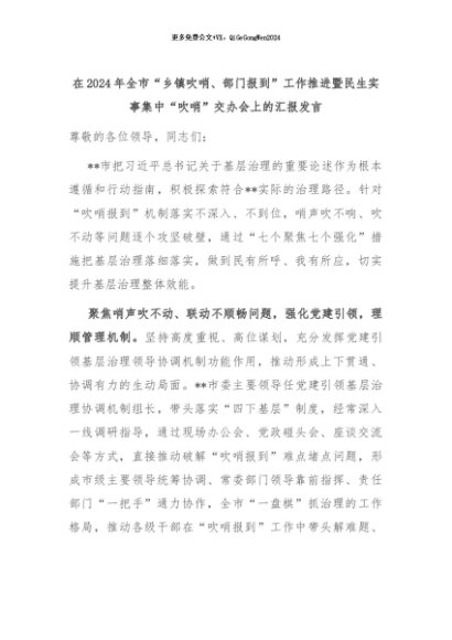 【七哥公文】2024年:在2024年全市“乡镇吹哨、部门报到”工作推进暨民生实事集中“吹哨”交办会上的汇报发言+更多免费公文+VX:QiGeGongWen2024