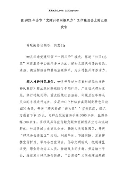 【七哥公文】2024年:在2024年全市“党建引领网格聚力”工作座谈会上的汇报发言+更多免费公文+VX:QiGeGongWen2024