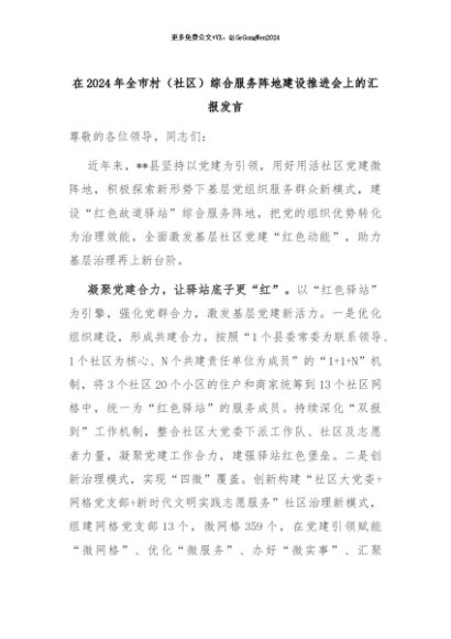 【七哥公文】2024年:在2024年全市村(社区)综合服务阵地建设推进会上的汇报发言+更多免费公文+VX:QiGeGongWen2024