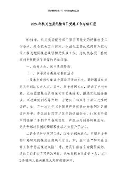 / 【七哥公文】2024年:2024年机关党委纪检部门党建工作总结汇报+更多免费公文+VX:QiGeGongWen2024
