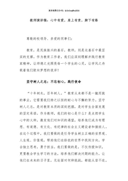 【七哥公文】2024年:教师演讲稿:心中有爱,肩上有责,脚下有路+更多免费公文+VX:QiGeGongWen2024+更多免费公文+VX:QiGeGongWen2024