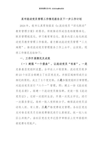 【七哥公文】2024年:某市流动党员管理工作情况报告及下一步工作计划+更多免费公文+VX:QiGeGongWen2024+更多免费公文+VX:QiGeGongWen2024