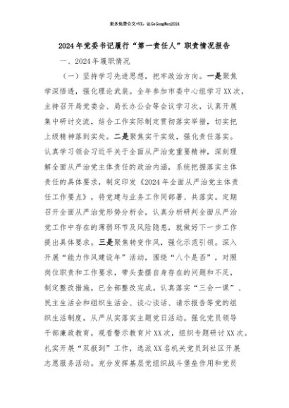 / 【七哥公文】2024年:2024年党委书记履行“第一责任人”职责情况报告+更多免费公文+VX:QiGeGongWen2024