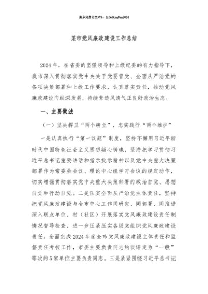 【七哥公文】2024年:某市党风廉政建设工作总结+更多免费公文+VX:QiGeGongWen2024+更多免费公文+VX:QiGeGongWen2024