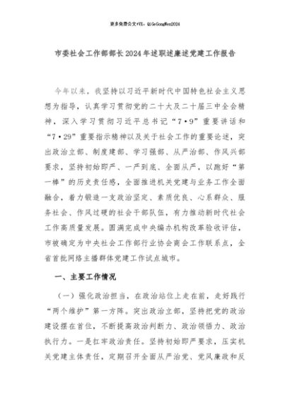 【七哥公文】2024年:市委社会工作部部长2024年述职述廉述党建工作报告+更多免费公文+VX:QiGeGongWen2024+更多免费公文+VX:QiGeGongWen2024