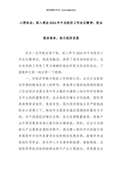 【七哥公文】2024年:心得体会:深入领会2024年中央经济工作会议精神,担当税务使命,助力经济发展+更多免费公文+VX:QiGeGongWen2024+更多免费公文+VX:QiGeGongWen2024