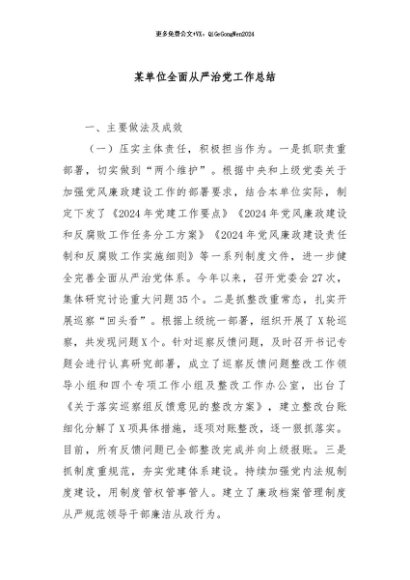【七哥公文】2024年:某单位全面从严治党工作总结+更多免费公文+VX:QiGeGongWen2024+更多免费公文+VX:QiGeGongWen2024