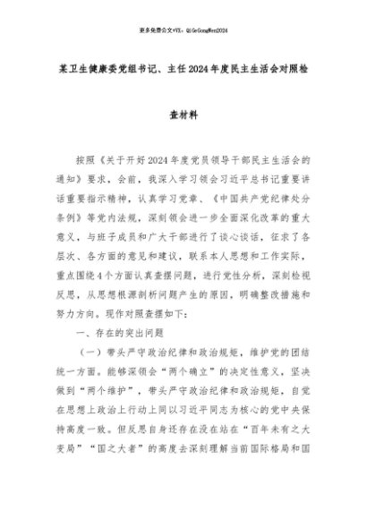 【七哥公文】2024年:某卫生健康委党组书记、主任2024年度民主生活会对照检查材料+更多免费公文+VX:QiGeGongWen2024+更多免费公文+VX:QiGeGongWen2024