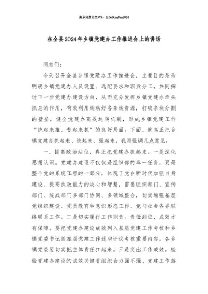 【七哥公文】2024年:在全县2024年乡镇党建办工作推进会上的讲话+更多免费公文+VX:QiGeGongWen2024+更多免费公文+VX:QiGeGongWen2024