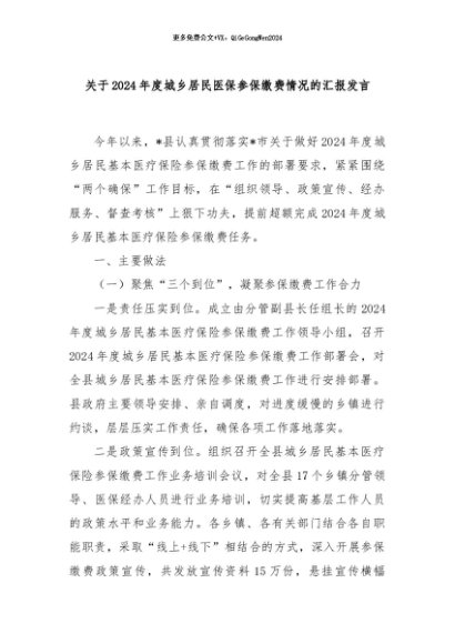 【七哥公文】2024年:关于2024年度城乡居民医保参保缴费情况的汇报发言+更多免费公文+VX:QiGeGongWen2024+更多免费公文+VX:QiGeGongWen2024