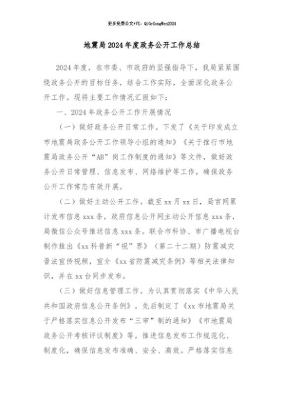【七哥公文】2024年:地震局2024年度政务公开工作总结+更多免费公文+VX:QiGeGongWen2024+更多免费公文+VX:QiGeGongWen2024