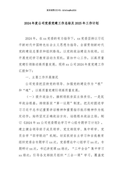 【七哥公文】2024年:2024年度公司党委党建工作总结及2025年工作计划+更多免费公文+VX:QiGeGongWen2024+更多免费公文+VX:QiGeGongWen2024