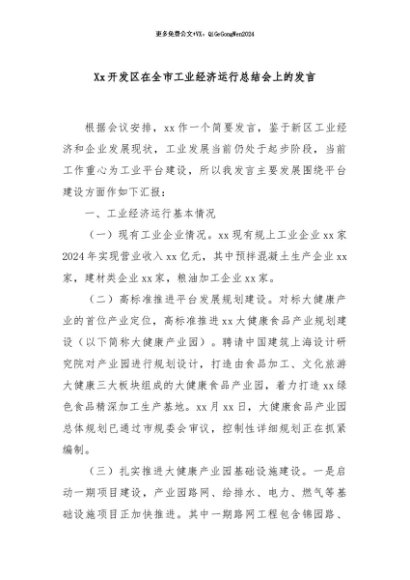 【七哥公文】2024年:Xx开发区在全市工业经济运行总结会上的发言+更多免费公文+VX:QiGeGongWen2024+更多免费公文+VX:QiGeGongWen2024