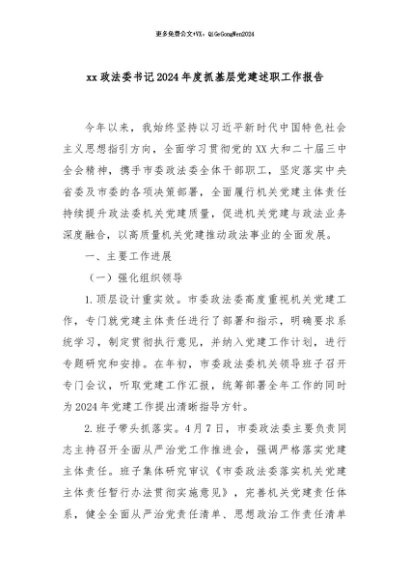 【七哥公文】2024年:xx政法委书记2024年度抓基层党建述职工作报告+更多免费公文+VX:QiGeGongWen2024+更多免费公文+VX:QiGeGongWen2024