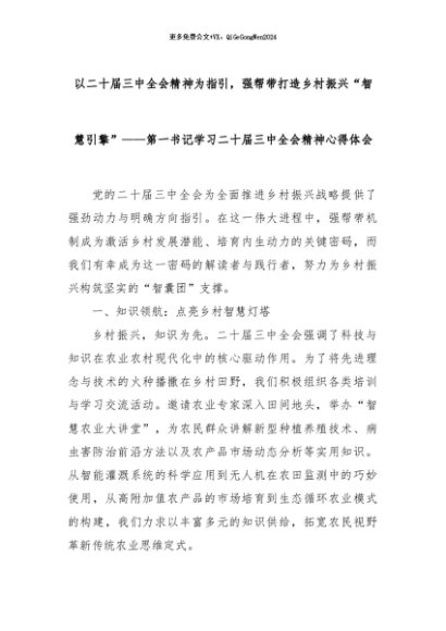 【七哥公文】2024年:以二十届三中全会精神为指引,强帮带打造乡村振兴“智慧引擎”——第一书记学习二十届三中全会精神心得体会+更多免费公文+VX:QiGeGongWen2024+更多免费公文+VX:QiGeGongWen2024
