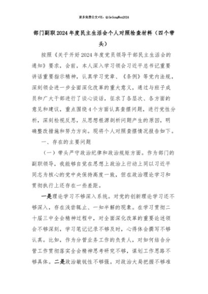 【七哥公文】2024年:部门副职2024年度民主生活会个人对照检查材料(四个带头)+更多免费公文+VX:QiGeGongWen2024+更多免费公文+VX:QiGeGongWen2024