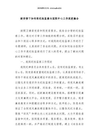 【七哥公文】2024年:新形势下如何将纪检监察与医院中心工作深度融合+更多免费公文+VX:QiGeGongWen2024+更多免费公文+VX:QiGeGongWen2024