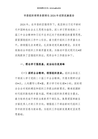 【七哥公文】2024年:市委组织部常务副部长2024年述职述廉报告+更多免费公文+VX:QiGeGongWen2024+更多免费公文+VX:QiGeGongWen2024