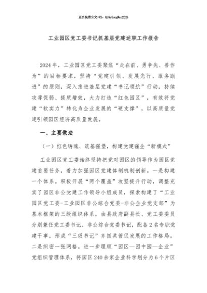 【七哥公文】2024年:工业园区党工委书记抓基层党建述职工作报告+更多免费公文+VX:QiGeGongWen2024+更多免费公文+VX:QiGeGongWen2024