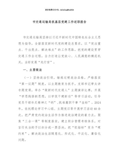 【七哥公文】2024年:市交通运输局抓基层党建工作述职报告+更多免费公文+VX:QiGeGongWen2024+更多免费公文+VX:QiGeGongWen2024