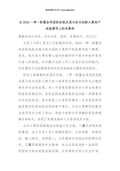 【七哥公文】2024年:在2024一带一路暨金砖国家技能发展与技术创新大赛助产技能赛项上的闭幕辞+更多免费公文+VX:QiGeGongWen2024+更多免费公文+VX:QiGeGongWen2024