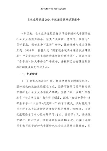 【七哥公文】2024年:县林业局党组2024年抓基层党建述职报告+更多免费公文+VX:QiGeGongWen2024+更多免费公文+VX:QiGeGongWen2024