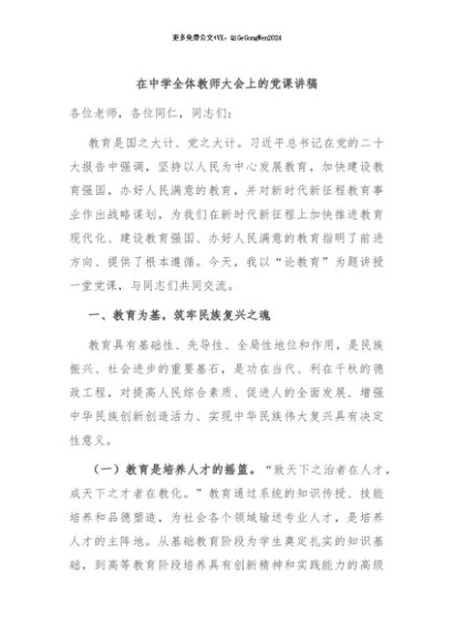 【七哥公文】2024年:在中学全体教师大会上的党课讲稿+更多免费公文+VX:QiGeGongWen2024+更多免费公文+VX:QiGeGongWen2024