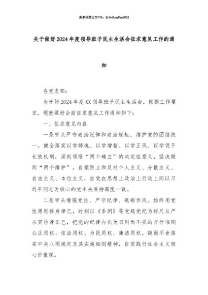 【七哥公文】2024年:关于做好2024年度领导班子民主生活会征求意见工作的通知+更多免费公文+VX:QiGeGongWen2024+更多免费公文+VX:QiGeGongWen2024