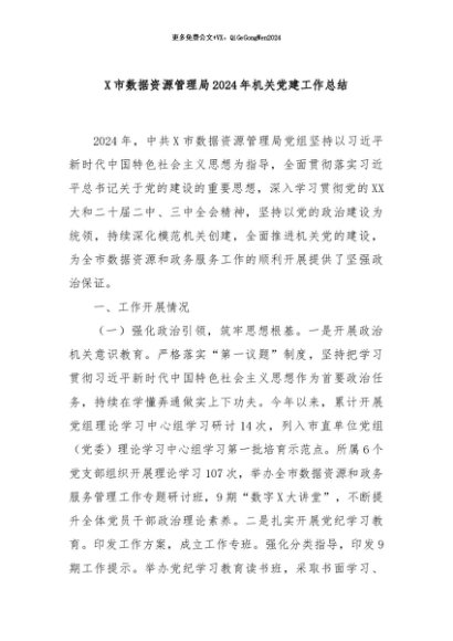 【七哥公文】2024年:X市数据资源管理局2024年机关党建工作总结+更多免费公文+VX:QiGeGongWen2024+更多免费公文+VX:QiGeGongWen2024