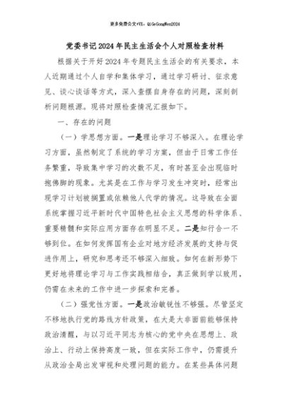 【七哥公文】2024年:党委书记2024年民主生活会个人对照检查材料+更多免费公文+VX:QiGeGongWen2024+更多免费公文+VX:QiGeGongWen2024