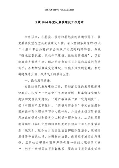 【七哥公文】2024年:X 镇 2024 年党风廉政建设工作总结+更多免费公文+VX:QiGeGongWen2024+更多免费公文+VX:QiGeGongWen2024