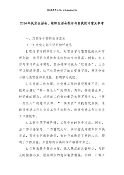 【七哥公文】2024年:2024年民主生活会、组织生活会批评与自我批评意见参考+更多免费公文+VX:QiGeGongWen2024+更多免费公文+VX:QiGeGongWen2024