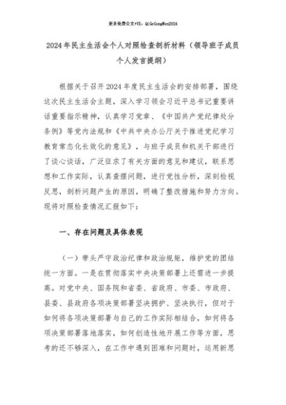 【七哥公文】2024年:2024年民主生活会个人对照检查剖析材料(领导班子成员个人发言提纲)+更多免费公文+VX:QiGeGongWen2024+更多免费公文+VX:QiGeGongWen2024