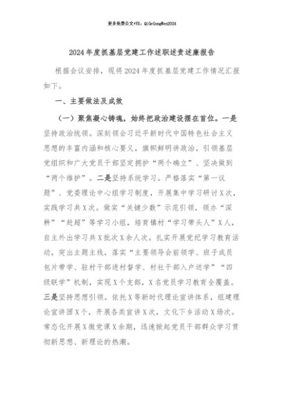 【七哥公文】2024年:2024年度抓基层党建工作述职述责述廉报告+更多免费公文+VX:QiGeGongWen2024+更多免费公文+VX:QiGeGongWen2024