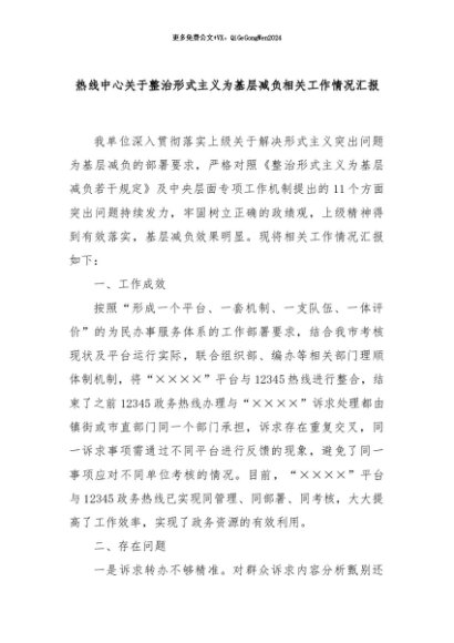 【七哥公文】2024年:热线中心关于整治形式主义为基层减负相关工作情况汇报+更多免费公文+VX:QiGeGongWen2024