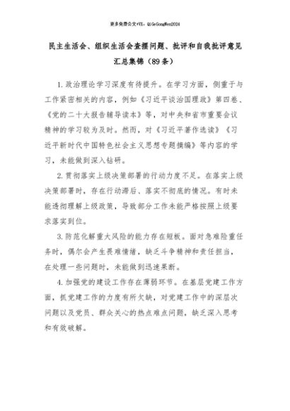 【七哥公文】2024年:(89条)民主生活会、组织生活会查摆问题、批评和自我批评意见汇总集锦+更多免费公文+VX:QiGeGongWen2024+更多免费公文+VX:QiGeGongWen2024